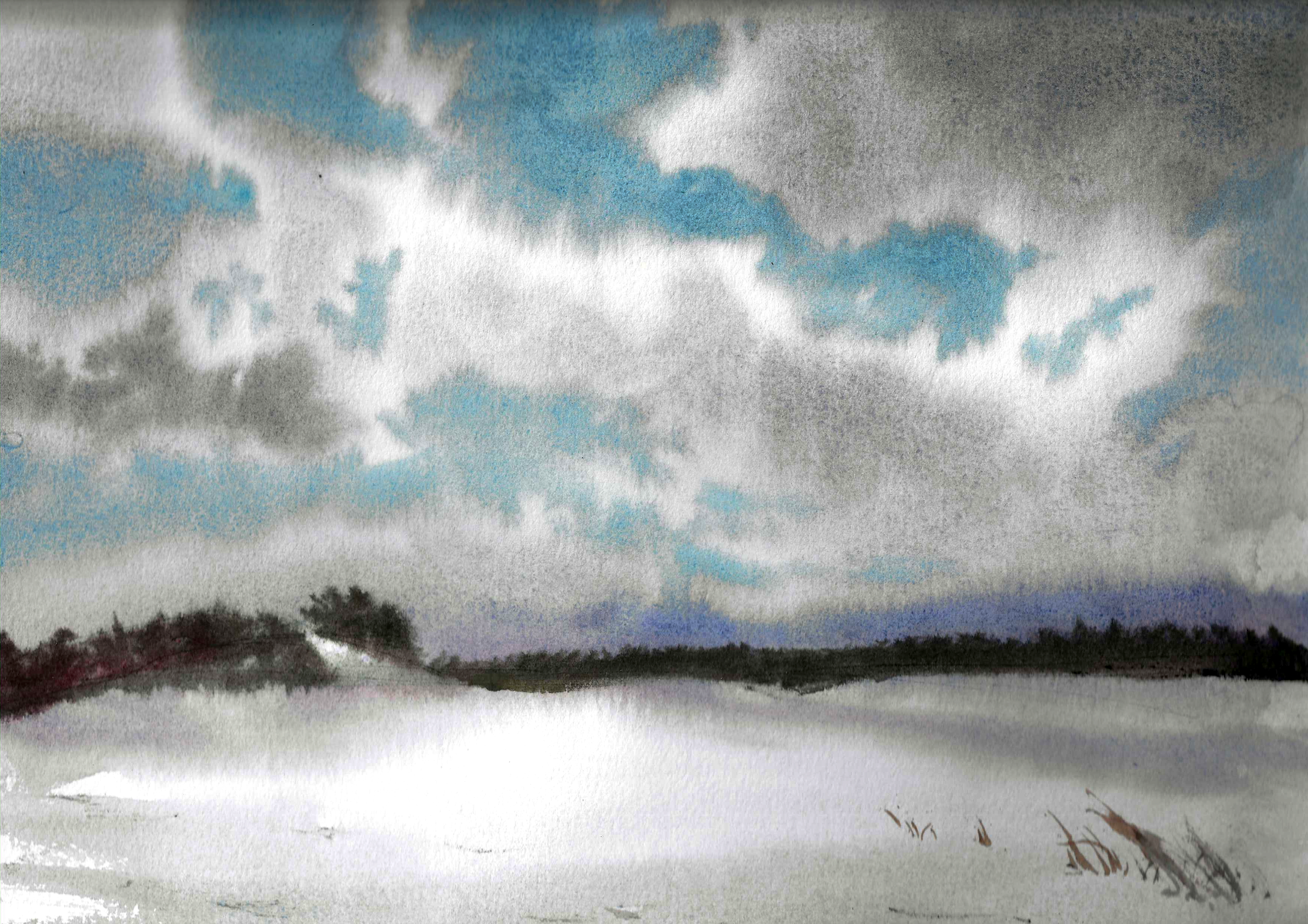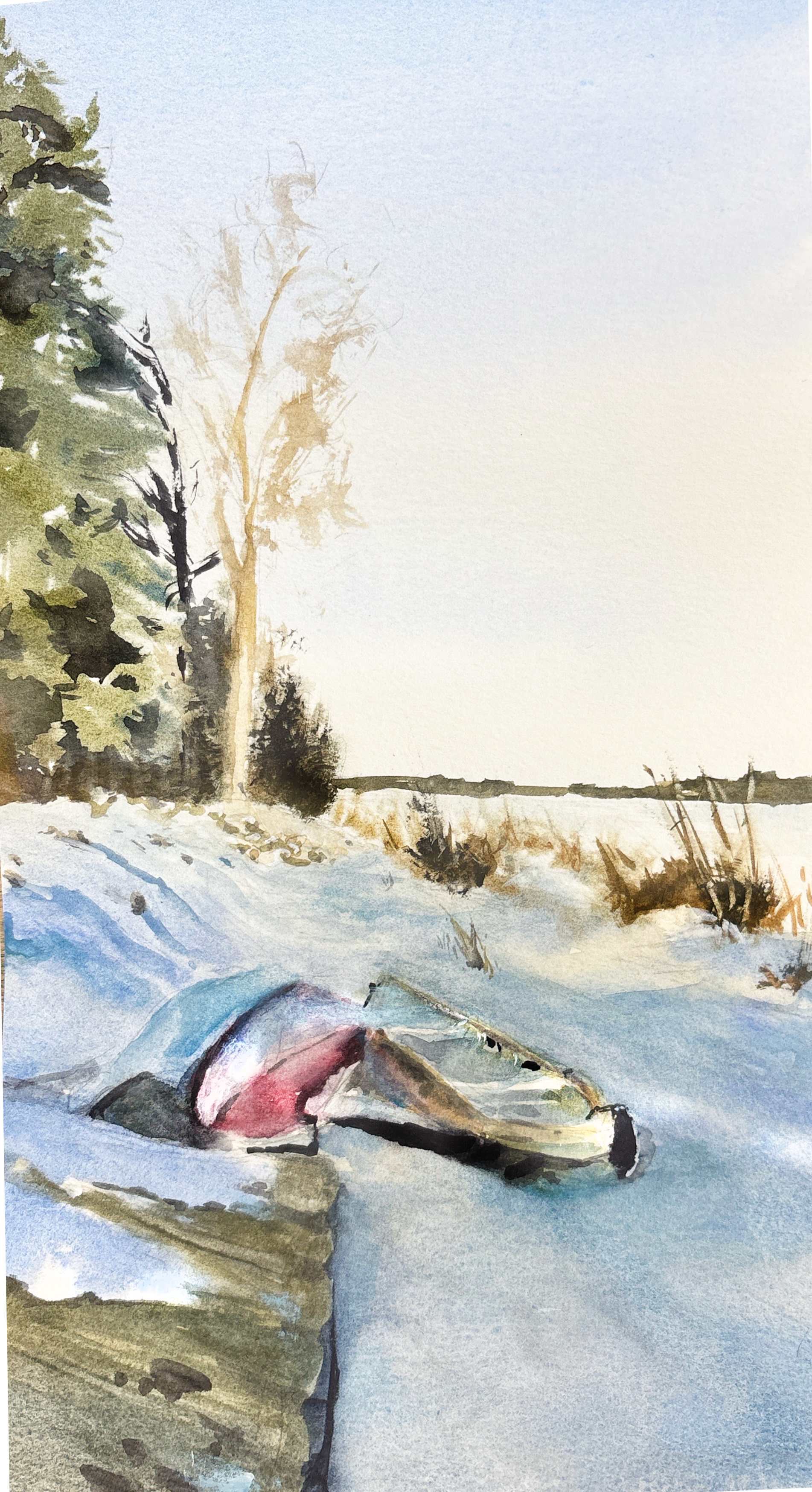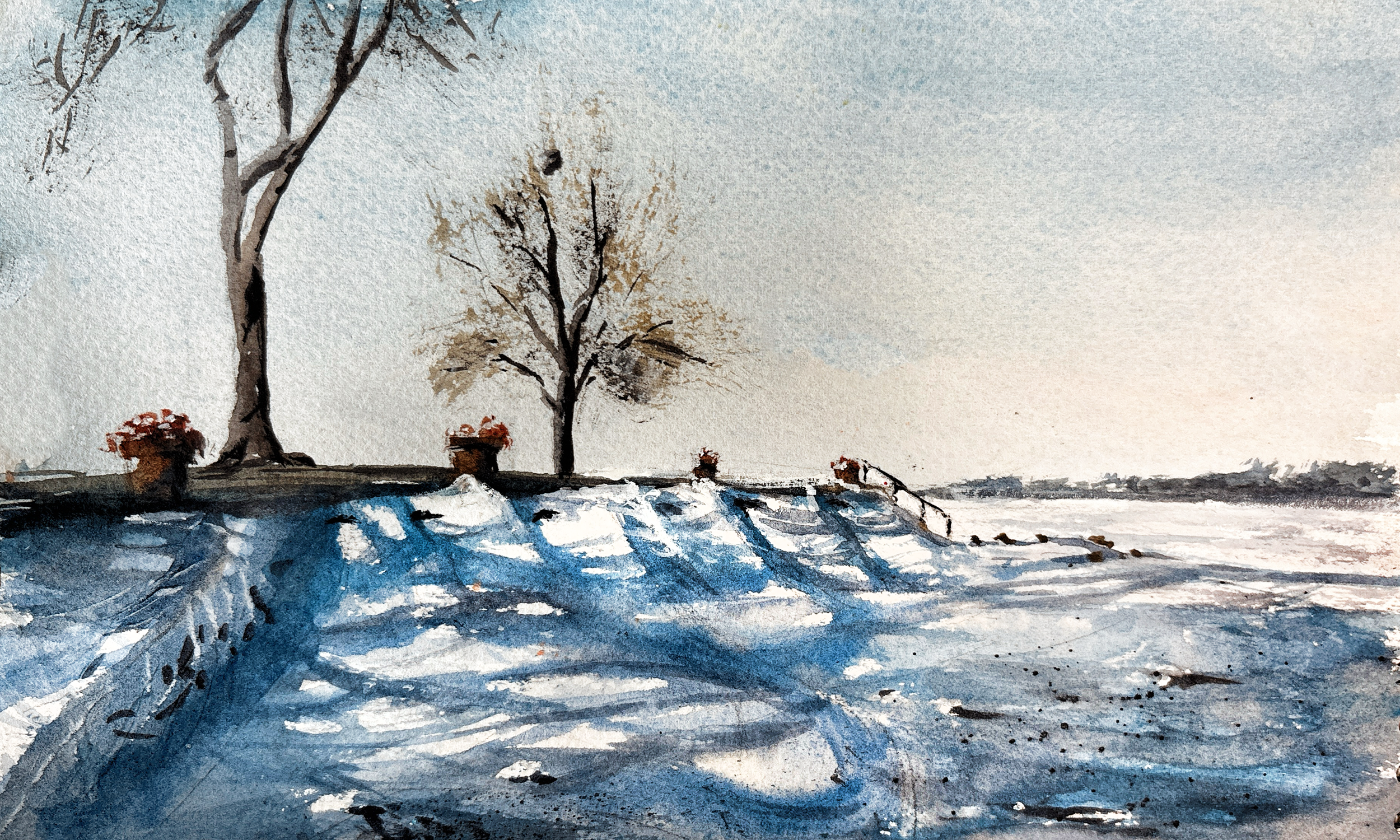 winter snow in field, 9×12, watercolor on paper